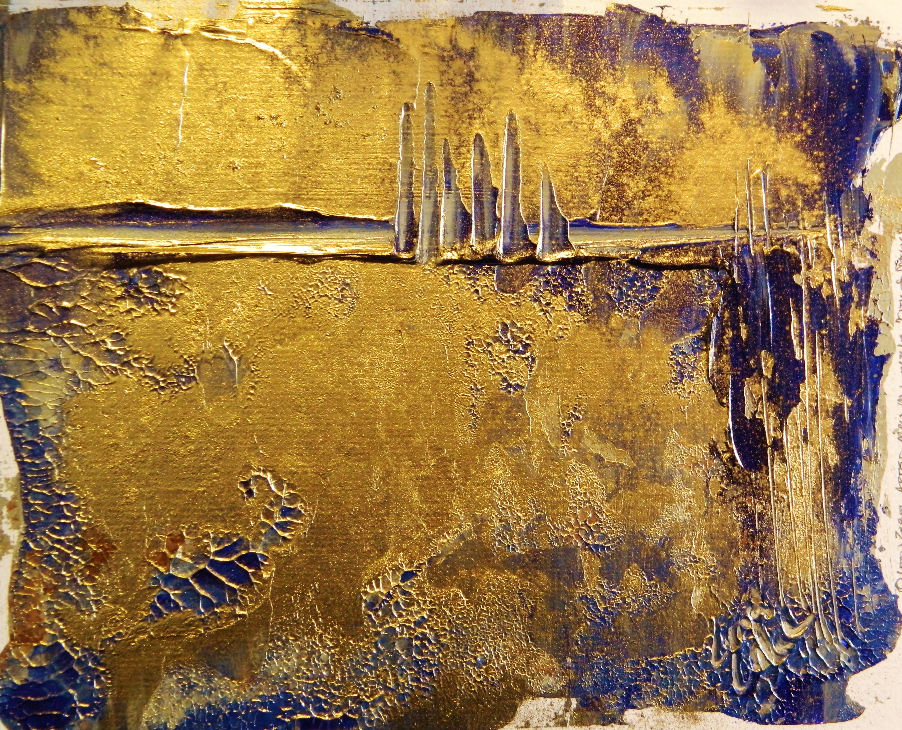 Acrylic on acid free mat with gold metalic powder. Framed in medium dark wood. 15 3/4 x 18 3/4