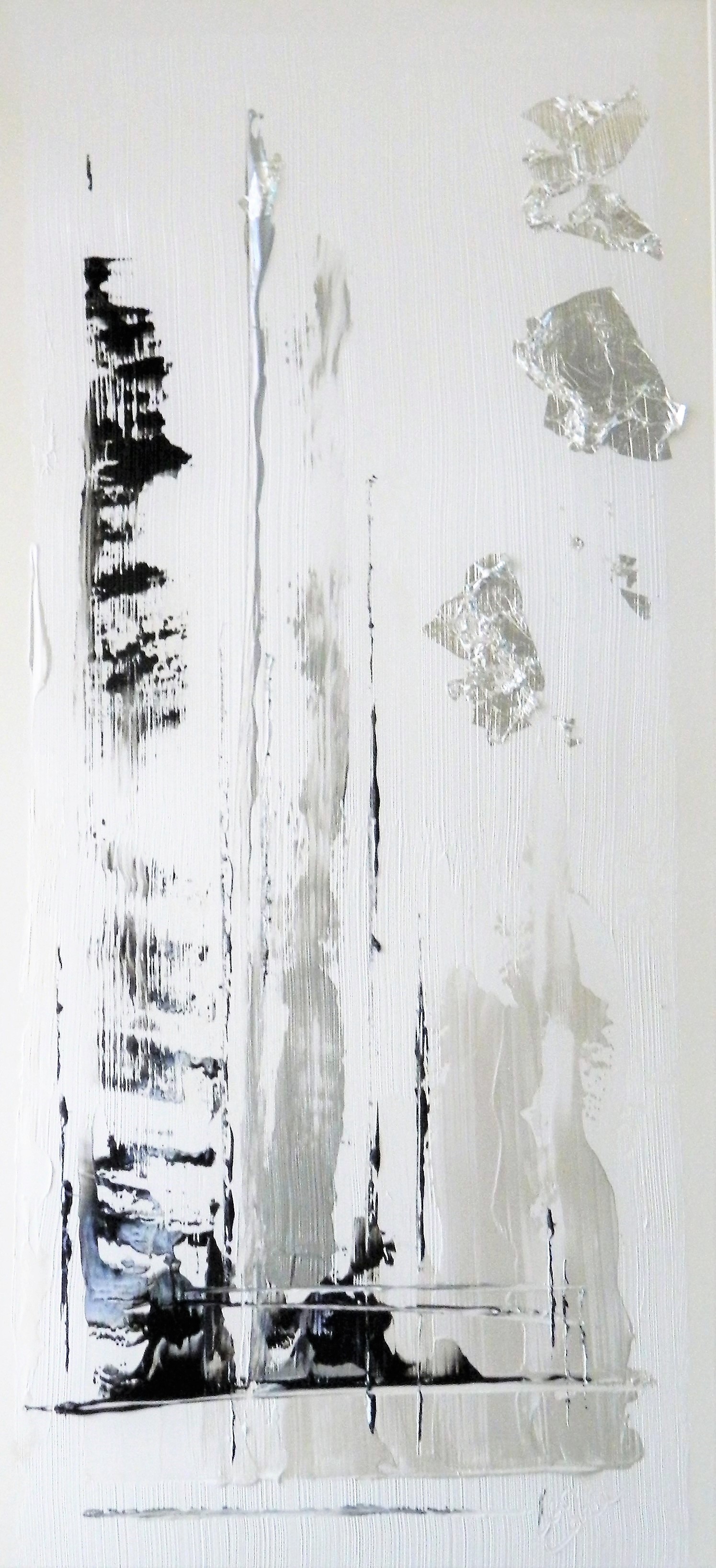 Acrylic on acid free matboard with genuine sterling silver leaf. Framed in silver wood