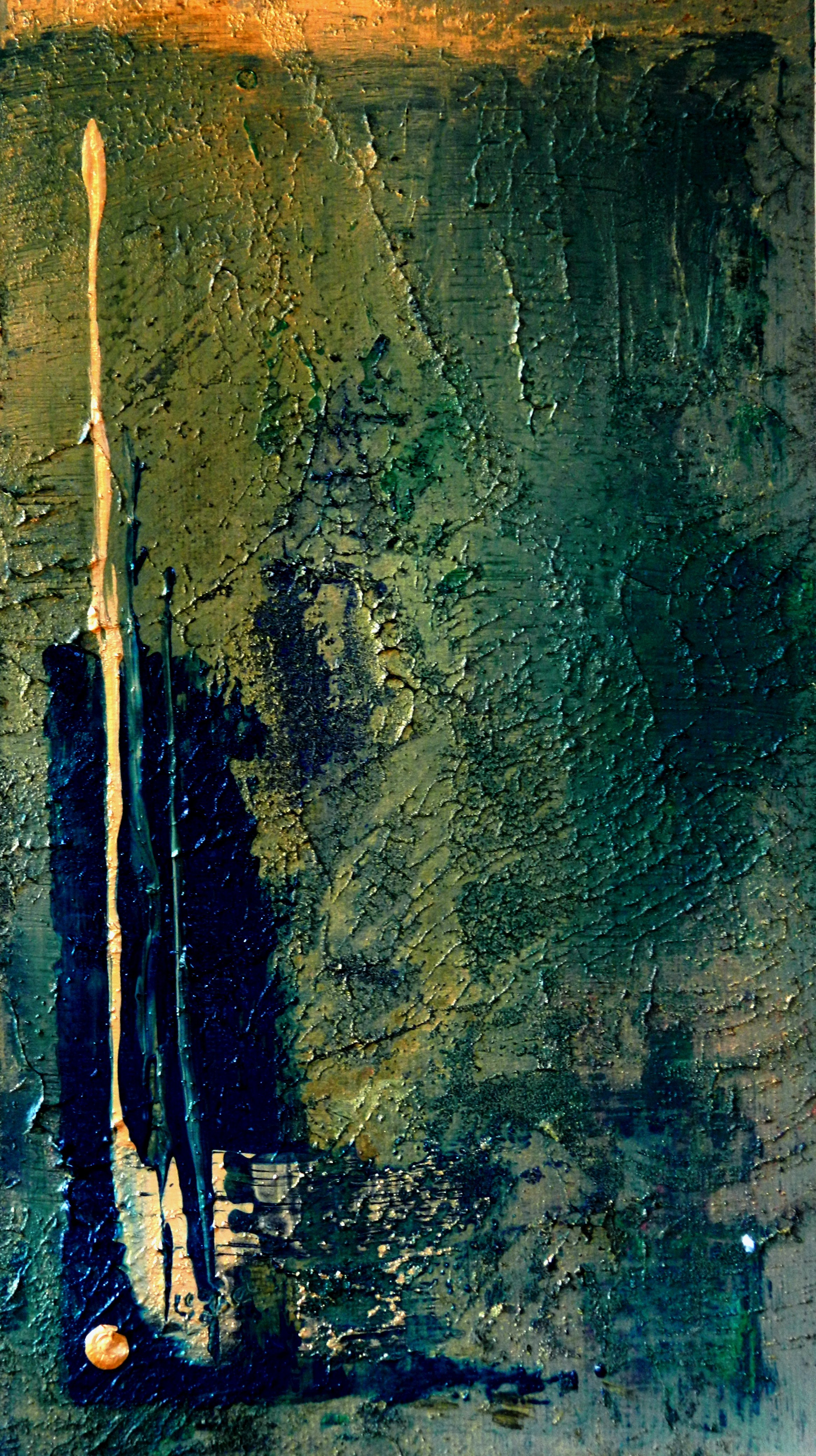 Acrylic on acid free matboard with micaceous iron oxide. Framed in copper wood. 21 3/8 x 30