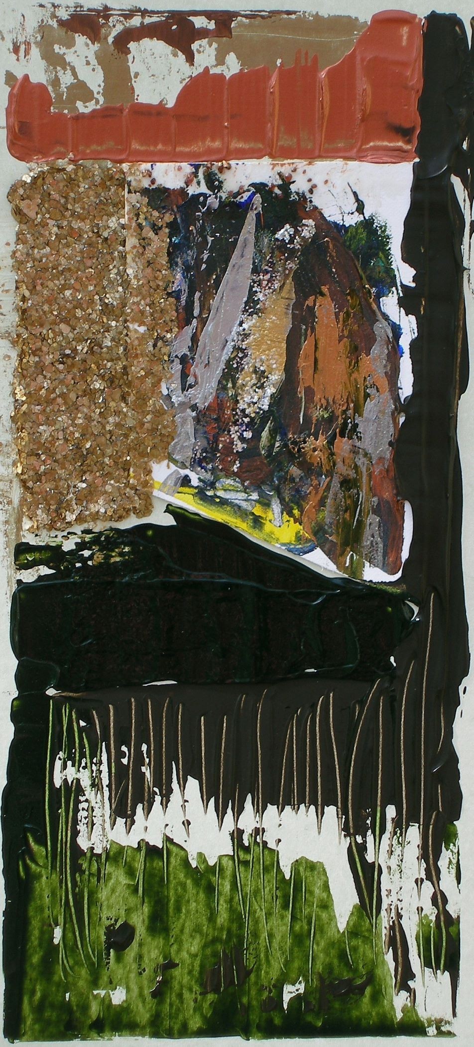 Acrylic on acid free matboard with mica stone. Framed in black wood. 19 x 39
